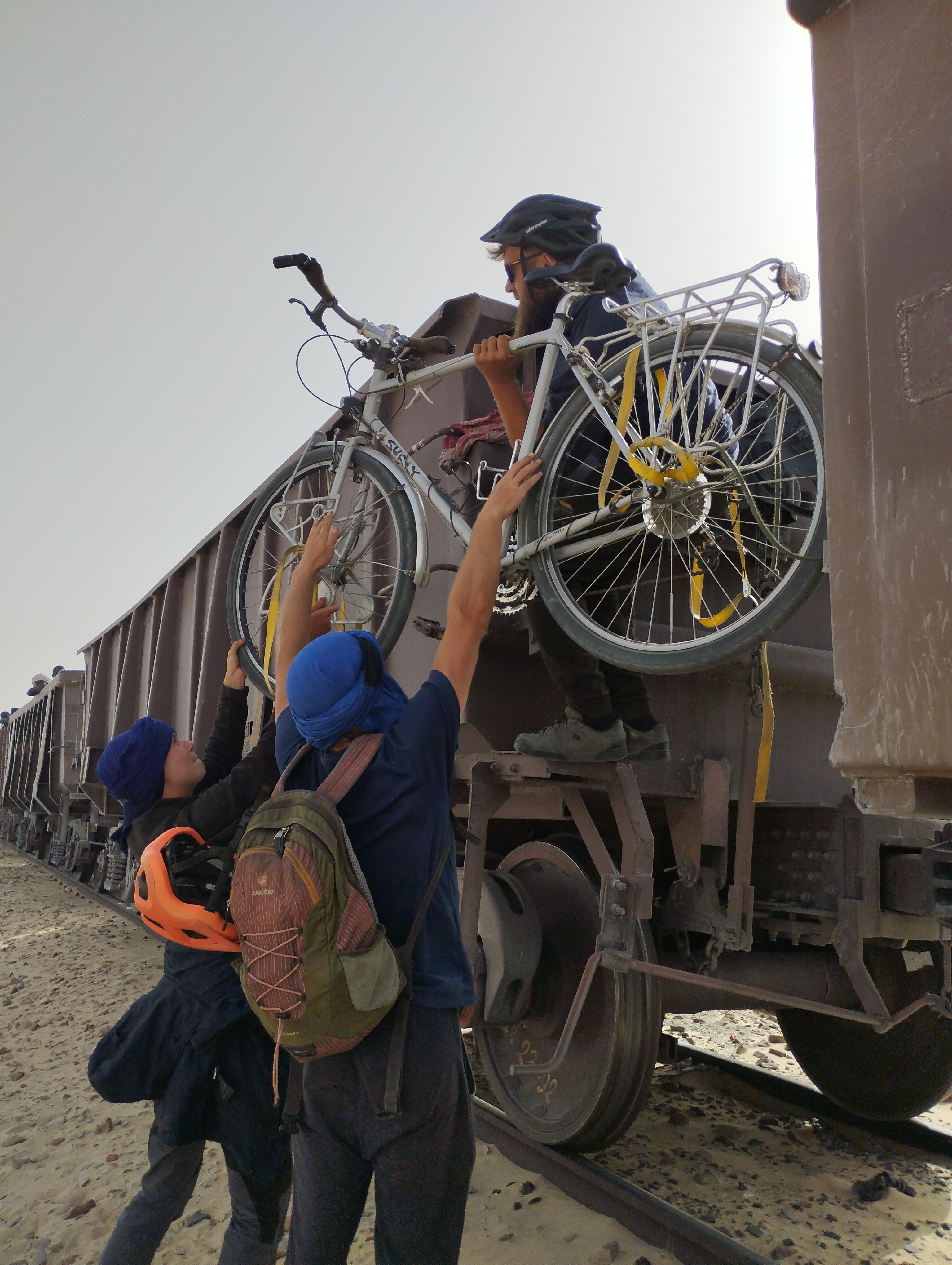 Si estás solo con tu bicicleta y tus alforjas, puedes acercarte, a la salida del tren, a los vagones donde se están instalando los lugareños. Siempre hay mauritanos que también viajan en los vagones pero a veces van en vagones muy lejanos. Si te acercas y pides ayuda amablemente, no habrá problema.