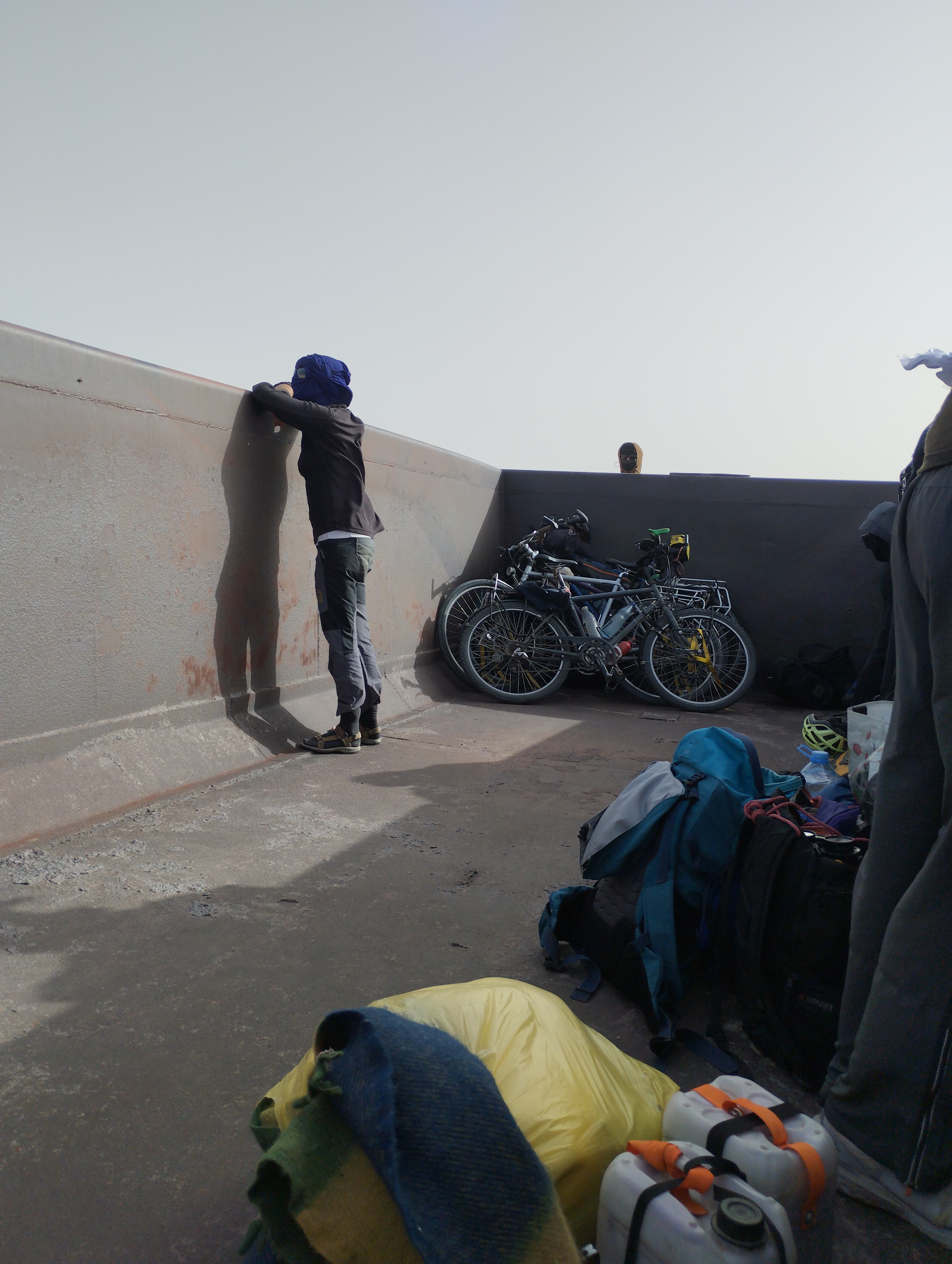 Tengo la suerte de estar acompañada a la ida por otros 3 ciclistas que conocí en el Sáhara Occidental: Steven, Ruth y Tobi, y a la vuelta por Steven. Afortunadamente éramos varios para cargar y descargar, nos costó bastante. ¡Tienes que montar las bicicletas con los brazos extendidos levantándolas completamente por encima de tu cabeza (ver foto)!