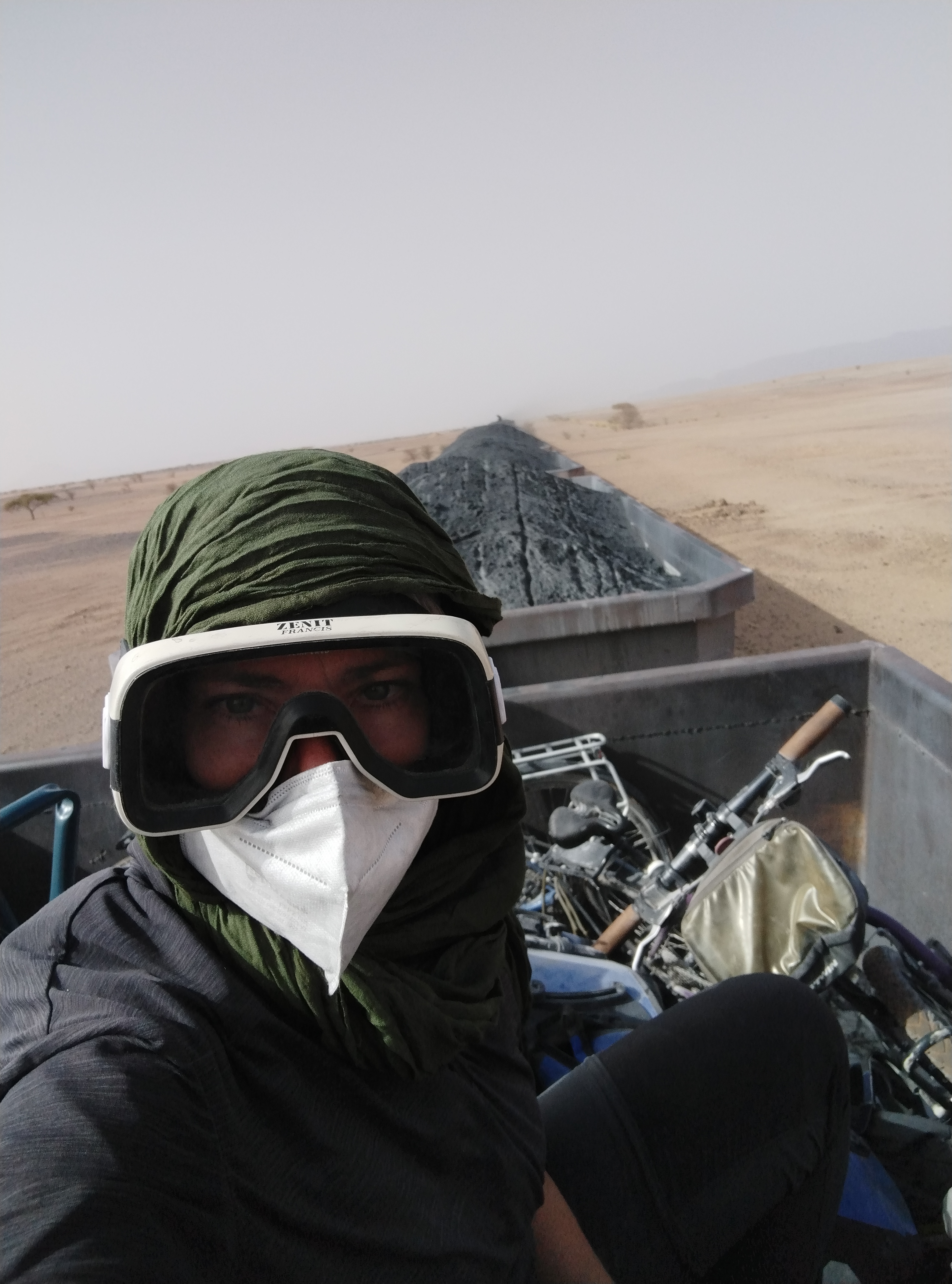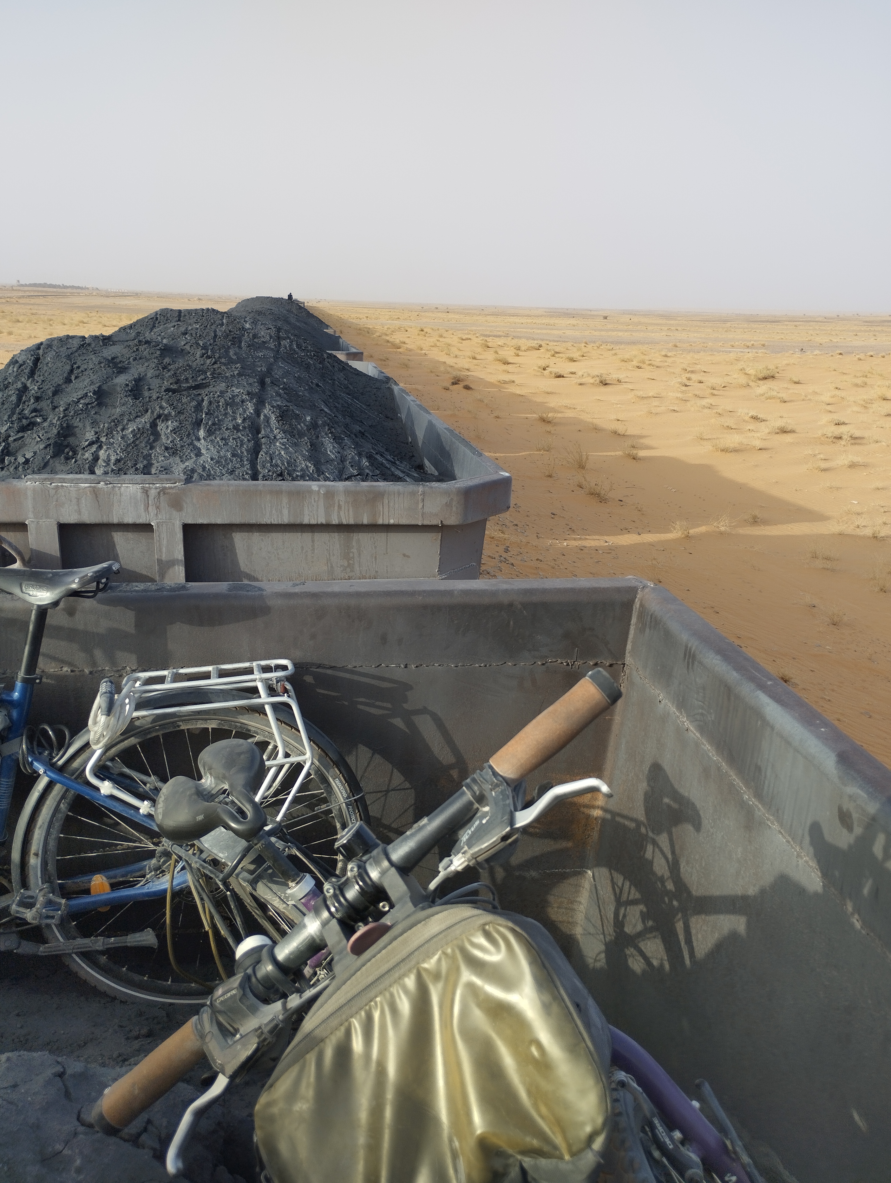 Como voy en bicicleta, decido coger el tren vacío hasta la última parada, Zouérate, porque pedalear allí me resulta demasiado largo, sobre todo con fuerte viento en contra. De esta manera puedo viajar en el tren lleno de mineral, que en mi opinión es más interesante, en la parte Zouérate – Choum, sin tener que regresar a Nuadibú. Así que hago la parte del tren lleno que se hace durante el día, porque a partir de Choum ya es tarde y ha caído la noche. Por tanto, no podemos apreciar el tren cargado y los paisajes del desierto.